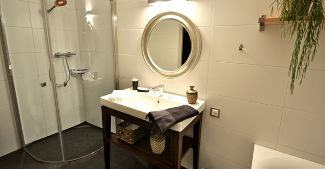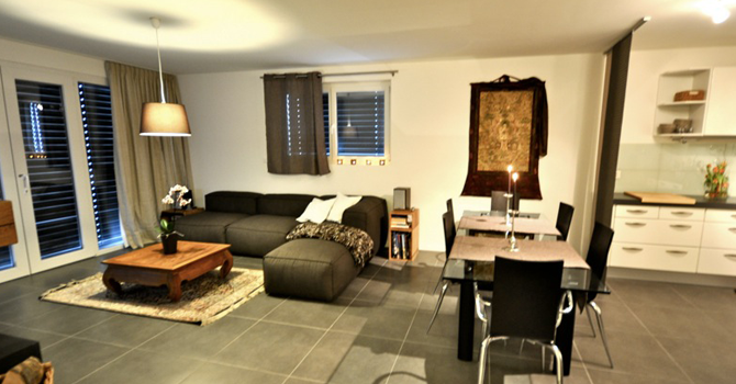 Magnifique appartement de 2.5 pièces (77 m2 habitable) de standing situé au rez-de-chaussée d’une villa d’architecte au bord du lac, exposition sud-est :